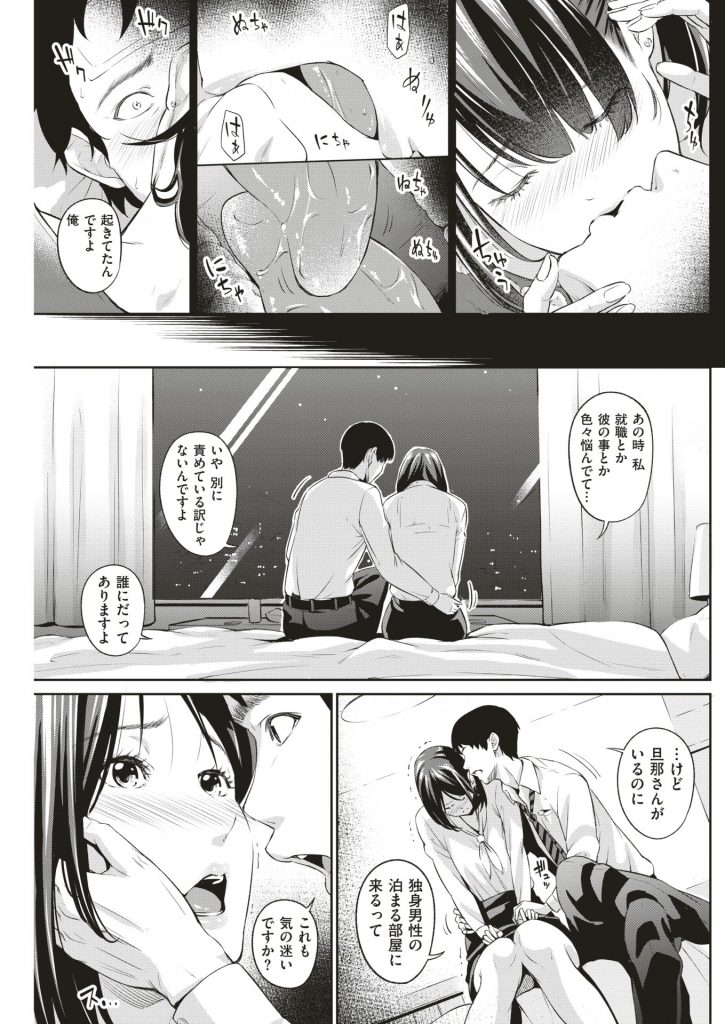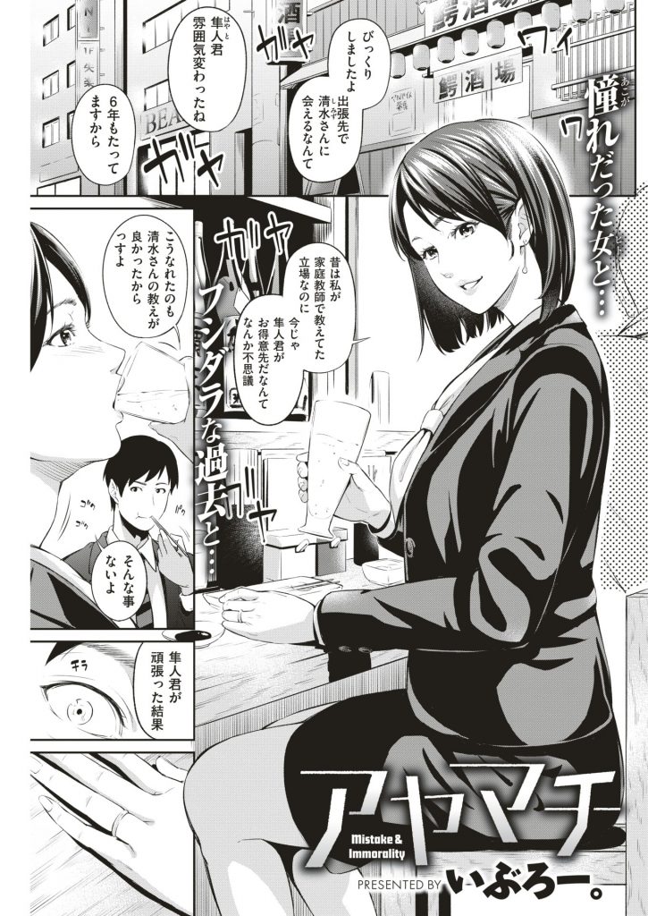 - >【エロ漫画】昔生徒だった男が綺麗な元家庭教師の人妻と出張先で再会し当時のアヤマチを掘り返しラブホでNTR浮気和姦!