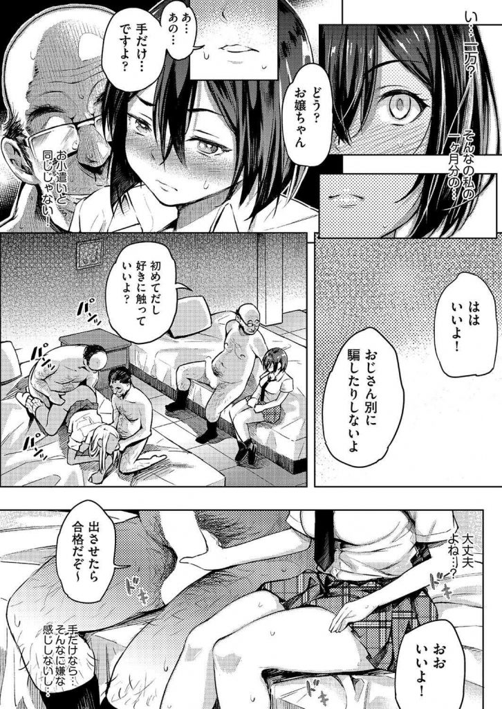 【エロ漫画】ソシャゲ廃人の黒髪JKが不良の黒ギャルに援交乱交パーティに連れて行かれ金欲しさにオジサン達の子種を懇願!