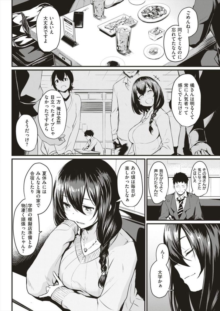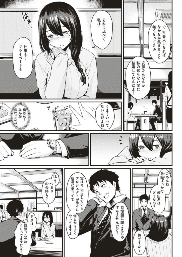 - >【エロ漫画】大学時代に憧れていた同級生美女に再会し社会人になってビッチなすれた姿を見せられるも告白してイチャH!
