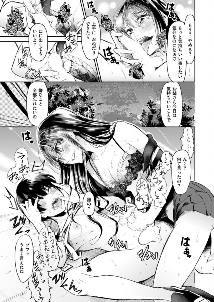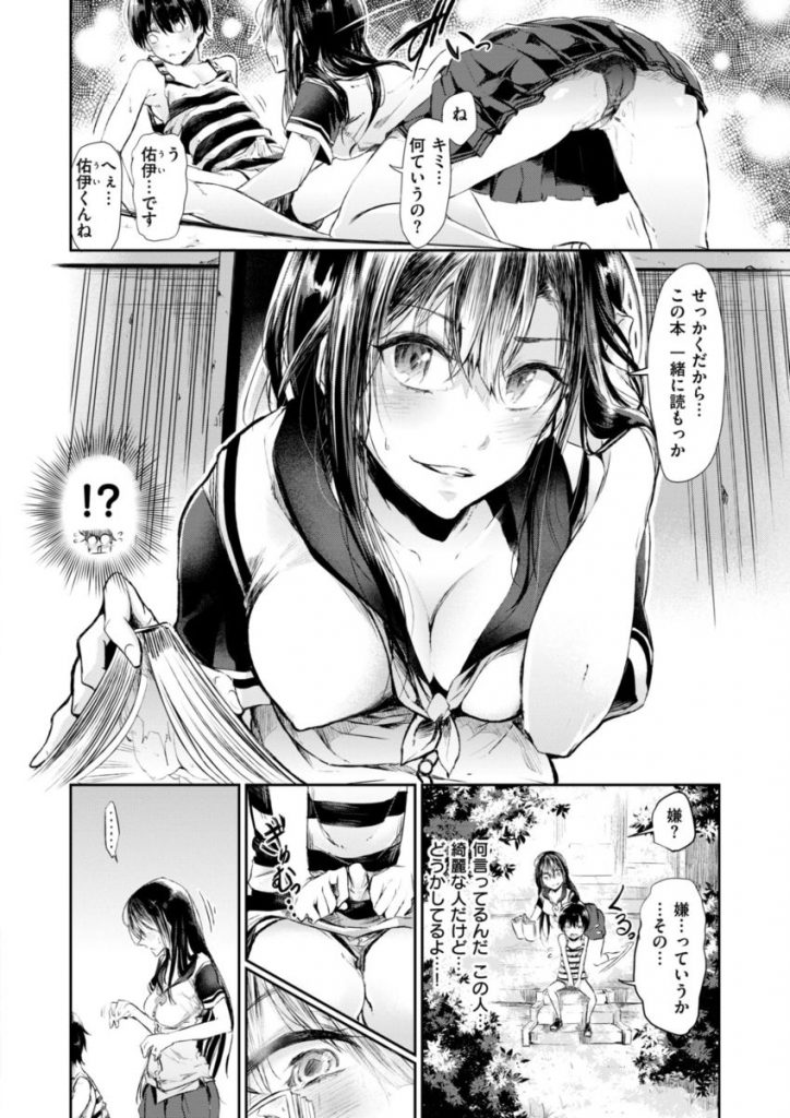 - >【エロ漫画】神社で少年が拾ったエロ本を見てたら持ち主のおねえさんが現れ一緒に読もうと誘われてH漫画知識で初エッチ!