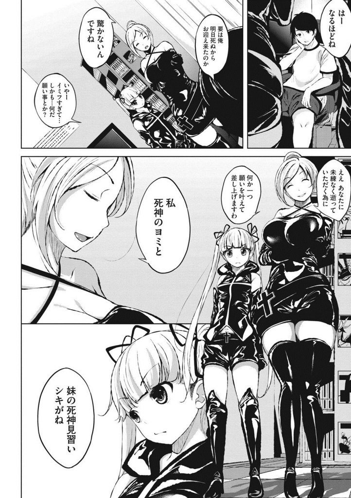 - >【エロ漫画】明日死ぬ男に1つだけ願いを叶えに来た死神姉妹のロリ妹との結婚を要求したら制服コスで恋人セックスに発展!