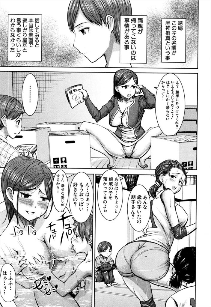 ママさんバレーして健康的なほのぼの家族の奥さんが隣に引っ越してきた家に挨拶に行くと少年が一人ぼっちで居たのを見かねて自宅に招き風呂に入ると熟女のおっぱい吸ってビンビンのショタペニスを突っ込まれ中だしオシッコ!
