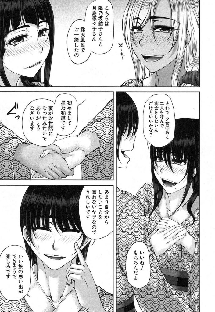 【エロ漫画】二人の淫乱ギャルがビッチの集まる温泉旅館で人妻に近づき夫婦を部屋飲みに誘い酔い潰して旦那を逆寝取り!