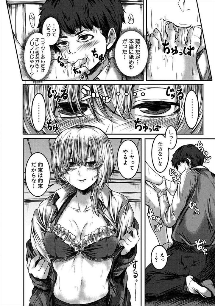 【エロ漫画】童貞男にセックス懇願される経験豊富なJKが蒸れた足を舐めさせてゴム付きHで早漏な絶倫チンポにイキ狂う!