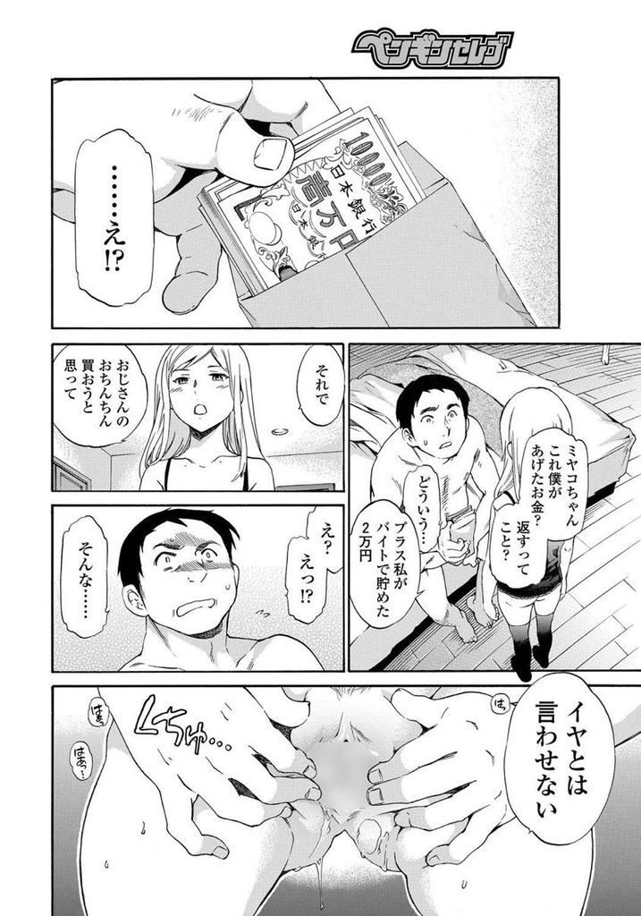 - >【エロ漫画】所帯持ちの中年男との援交で素股までしかしてもらえず焦らされ続けるJKが今まで貰ったお金でチンコを買う!