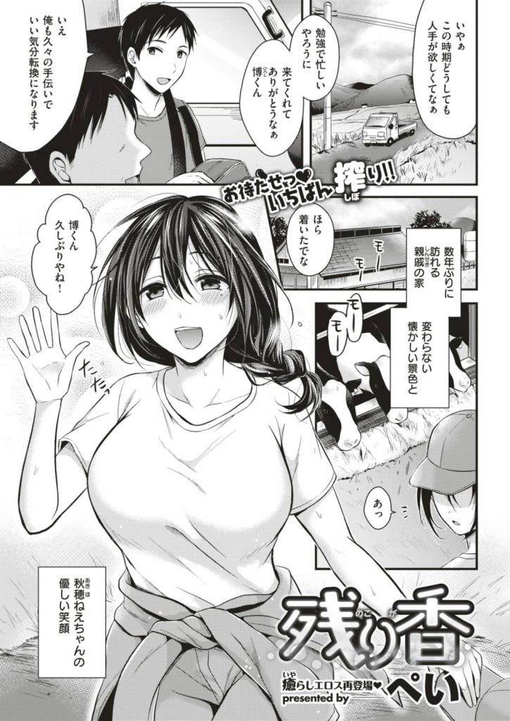 親戚の家で親戚の巨乳お姉さんと再会したら昔と変わらない石鹸の匂いがして勃起してしまう!子供の頃にお風呂場で触り合いっこした時の事を思い出しながら入浴してるとお姉さんが入ってきておっぱいを背中に押し当て触り合いっこが始まりる!お姉さんが来年にお見合い結婚すると言いだし今日で最後と言われ最初で最後のジェラシーエッチでぶっかける!