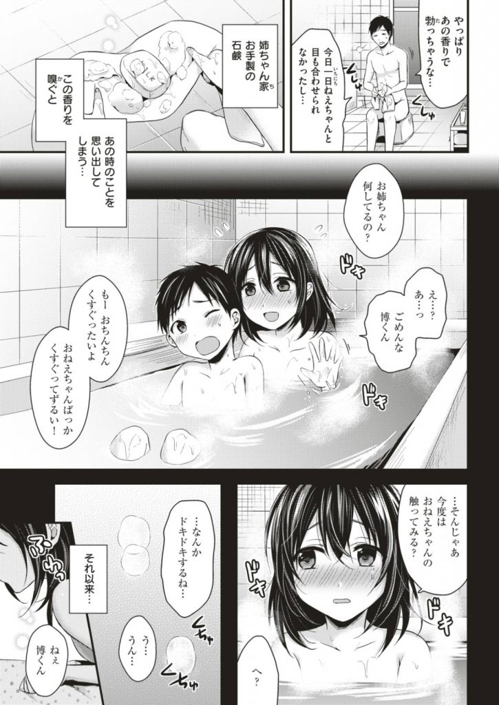 【エロ漫画】再会した親戚の巨乳お姉さんと風呂場で昔の様に触り合いっこしたら結婚する事を知り最初で最後の生セックス!