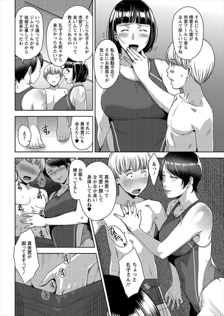 【エッチ漫画】市営プールで会った隣人の人妻美熟女ペアとムッチリ豊満ボディの3Pセックスダイエット!