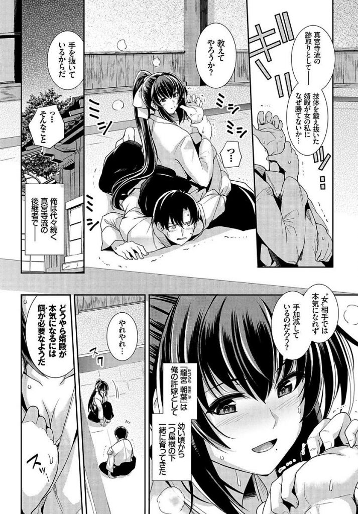 技体を鍛えぬいて自分より強いはずなのに女相手で力が出せない許嫁の婿殿に強くなって貰いたいと思う代々続く名家の巨乳娘!婿殿を餌で釣ろうと思い私に勝ったら身体を好きにしていいと言うが道着を脱ぎ捨てて立ち去ってしまう!その後に私の写真を見ながら名前を呼んでオナニーしてる婿殿を目撃したので押し倒しいちゃラブHでまぐあい大量膣内射精!