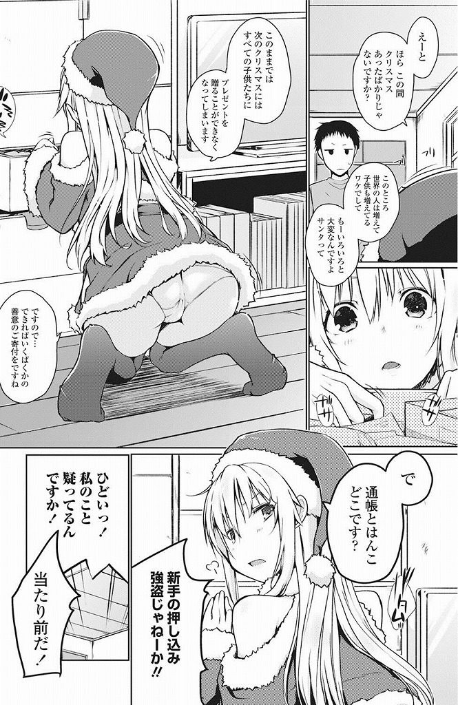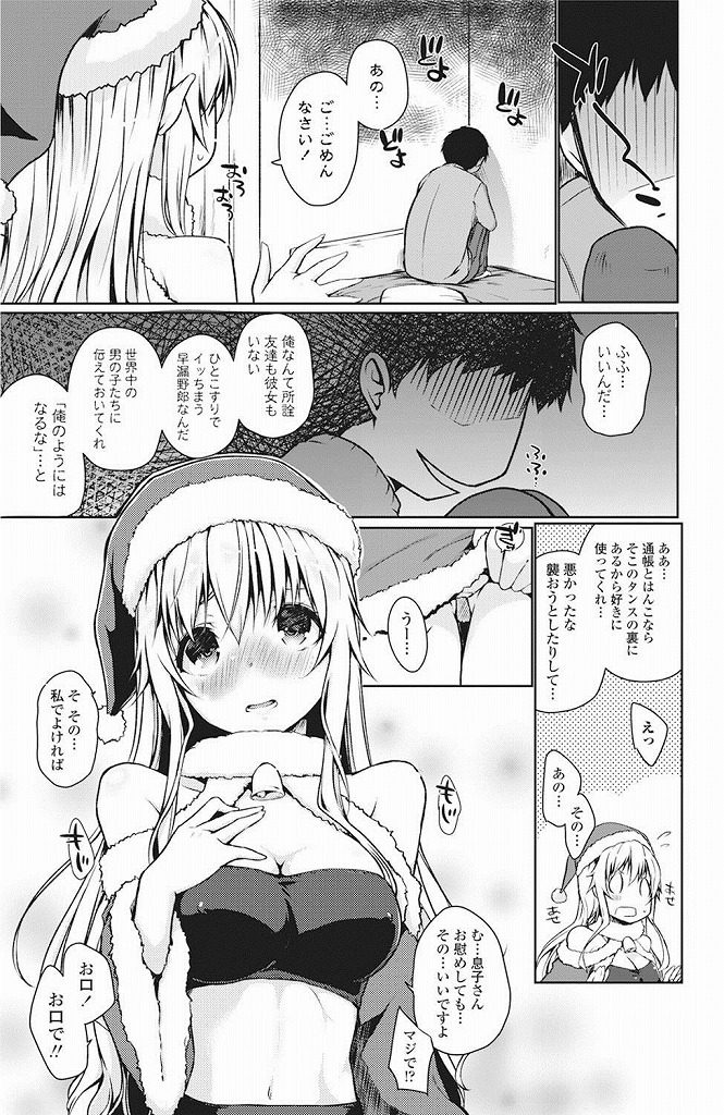 - >【エロ漫画】押し込み強盗に来たサンタコスの巨乳娘に早漏男が不憫に思われ慰めフェラして貰うと我慢出来ず処女まで頂く!