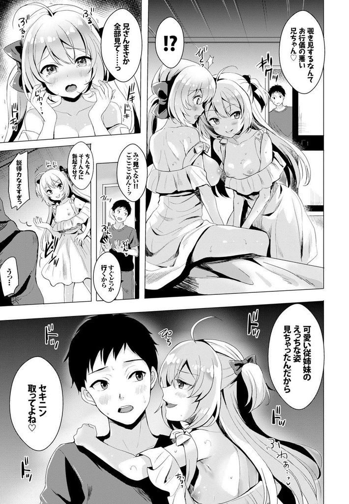 - >【エロ漫画】美しく成長した双子姉妹が久しぶりに再会した大好きな従兄にレズプレイを覗き見させ処女喪失の姉妹丼乱交に誘導する!