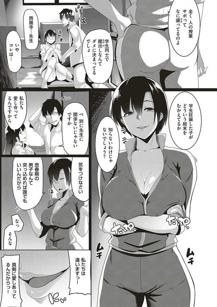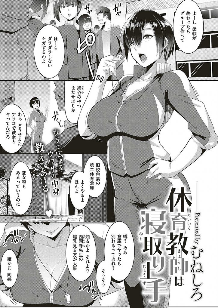 - >【エロ漫画】体育倉庫で盛るカップルに乱入し愛を試す爆乳体育教師が貧乳彼女の前でパイズリし逆NTRエッチで肉バイブにする!