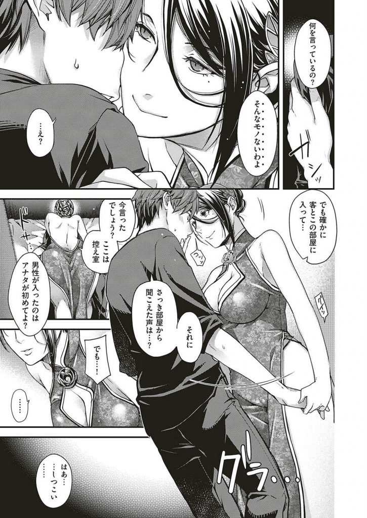 - >【エロ漫画】妖艶な色気でバーの常連客を惑わし特別室に連れ込む魔性のママが入って来た息子の童貞を奪いセックスを吟味する!