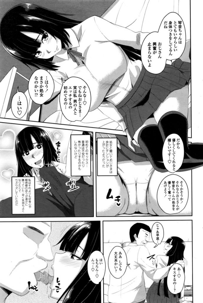 | 【2話】【エロ漫画】オナニーに嵌り性交に興味を持った黒髪JKがおじさんをホテルに誘い初体験を終えると念願の生ハメ中出しを敢行!(Now) |