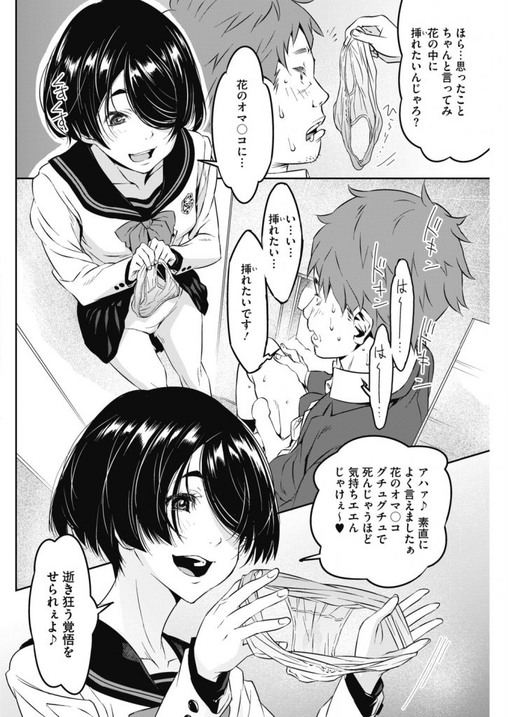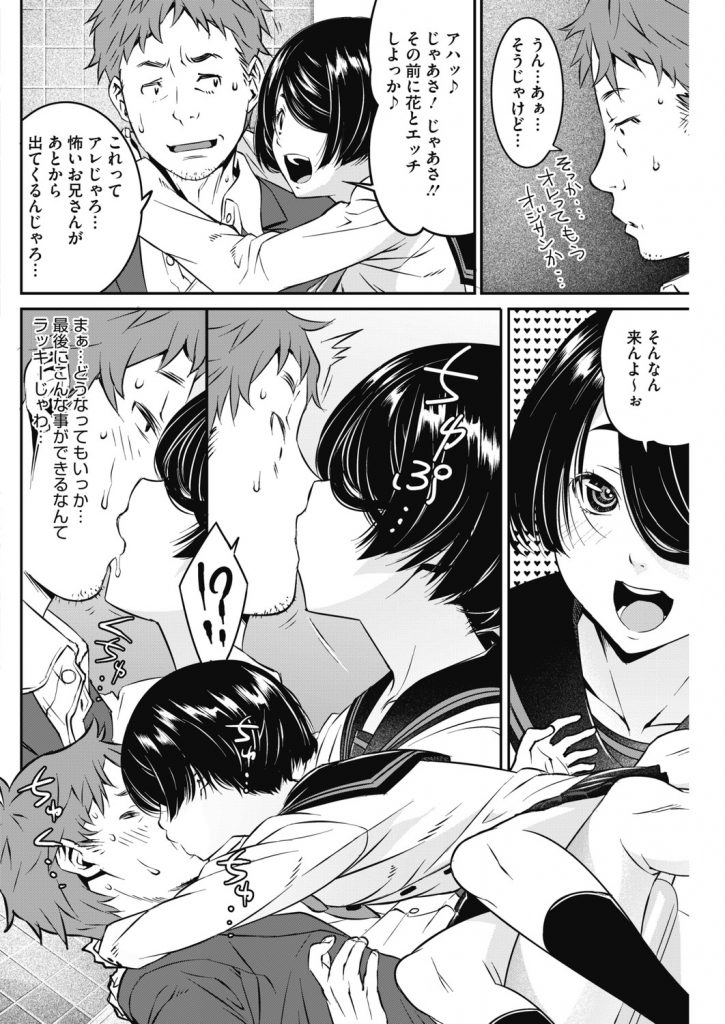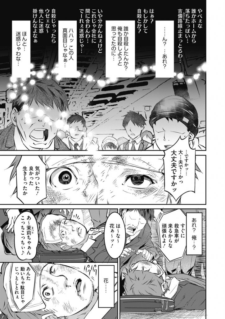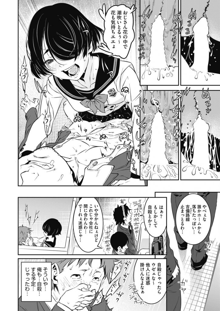 【エロ漫画】自殺する前に公衆便所の卑猥な落書きの電話番号に連絡したリーマンがホントに来た痴女JKと筆おろしSEXで昇天!