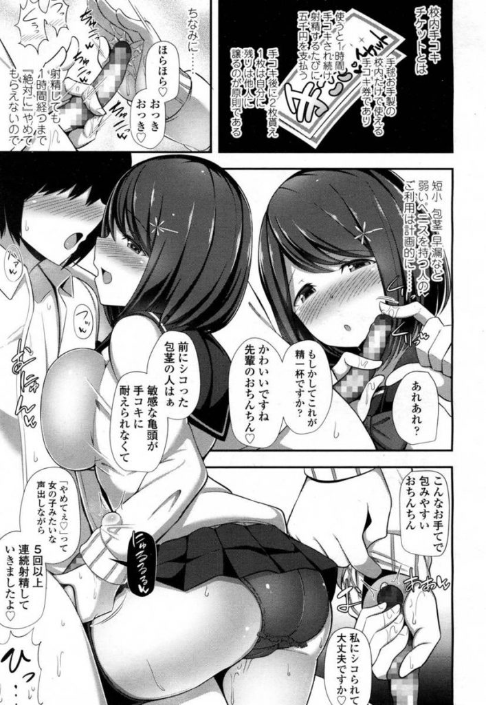 【エロ漫画】校内手コキチケットで稼ぐJKが祖チンを超絶テクとローションを駆使したお手てまんこでしごき精液を絞り上げる!