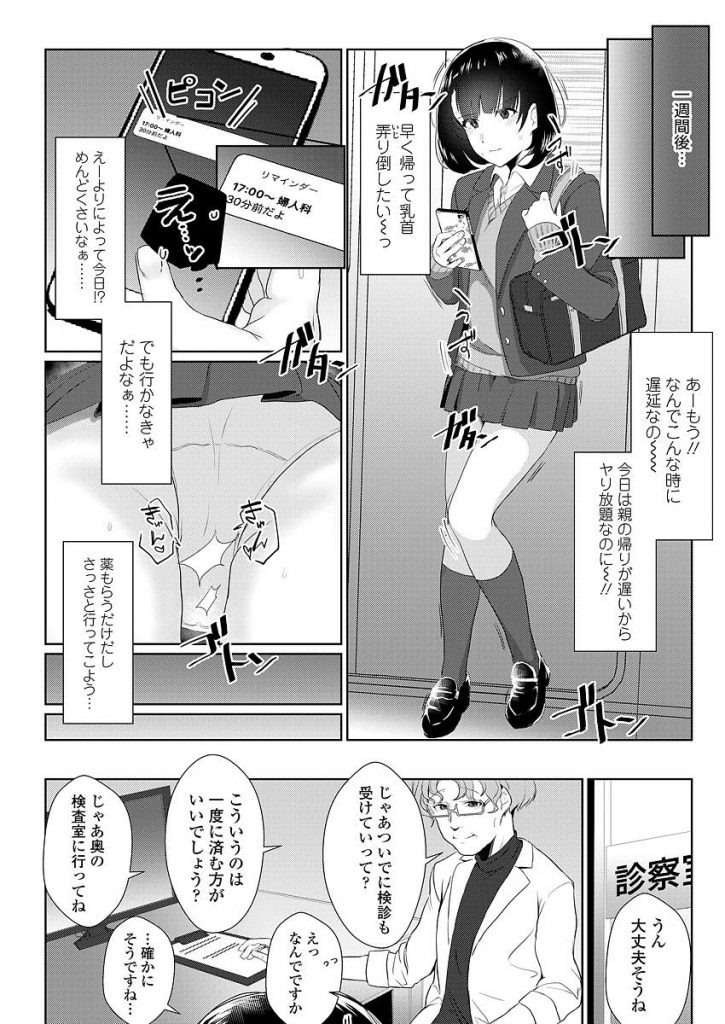 - >【エロ漫画】乳首オナニーのヤリすぎで腫れた乳頭に軟膏を塗って絆創膏を貼るJKが婦人科のスケベ医師に触診され乳首イキ!