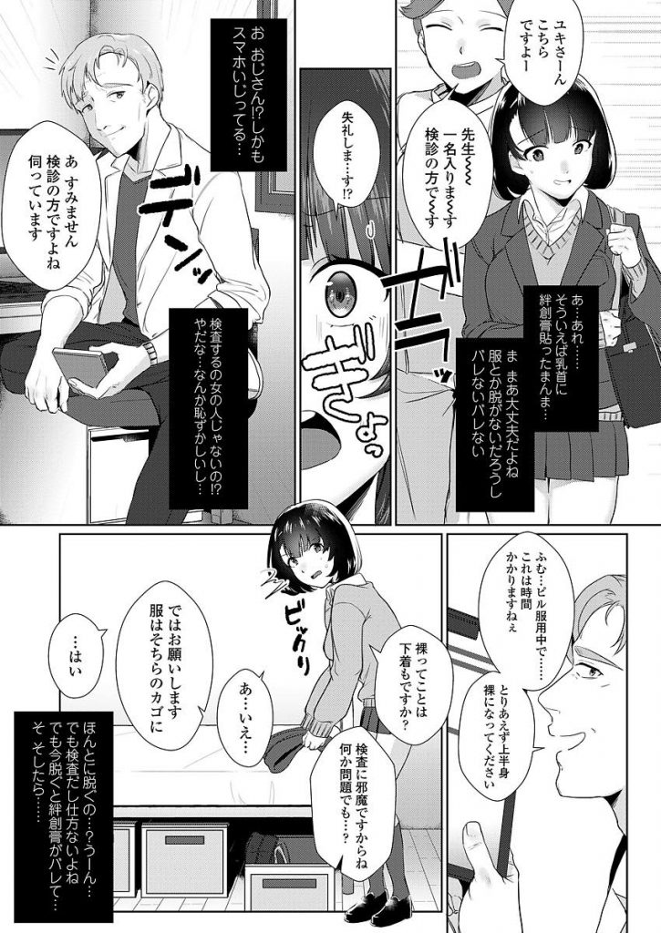 【エロ漫画】乳首オナニーのヤリすぎで腫れた乳頭に軟膏を塗って絆創膏を貼るJKが婦人科のスケベ医師に触診され乳首イキ!