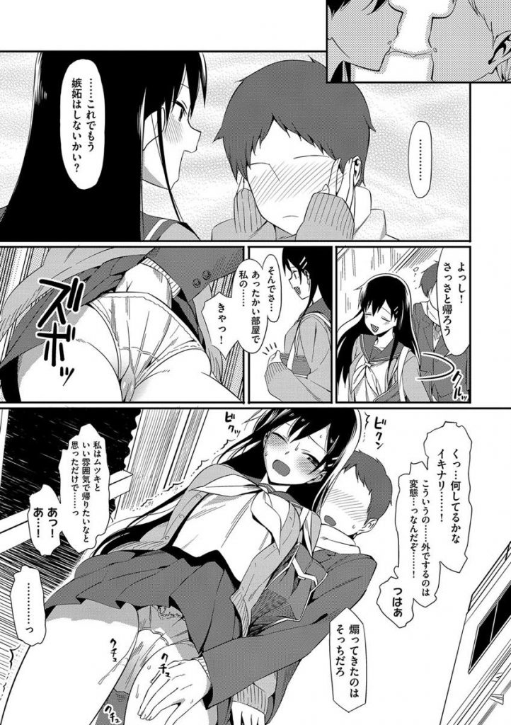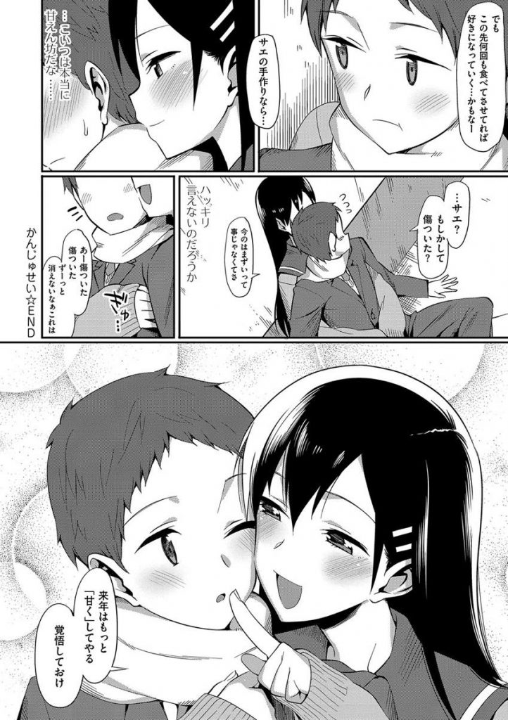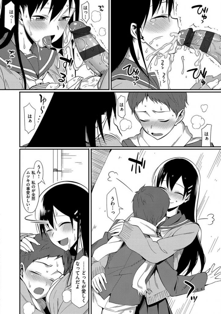 - >【エロ漫画】チョコを貰えなかった彼氏が人気者の黒髪彼女に嫉妬して甘えだし我慢出来ずに校舎裏でラブラブ中出し青姦!