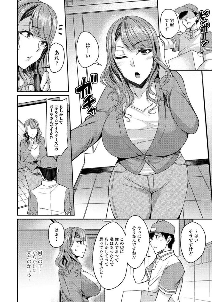 - >【エロ漫画】退屈な生活に不満を抱く元アイドルの人妻が大ファンと言う宅配業者に胸が高鳴り当時の衣装でコスプレ浮気H!