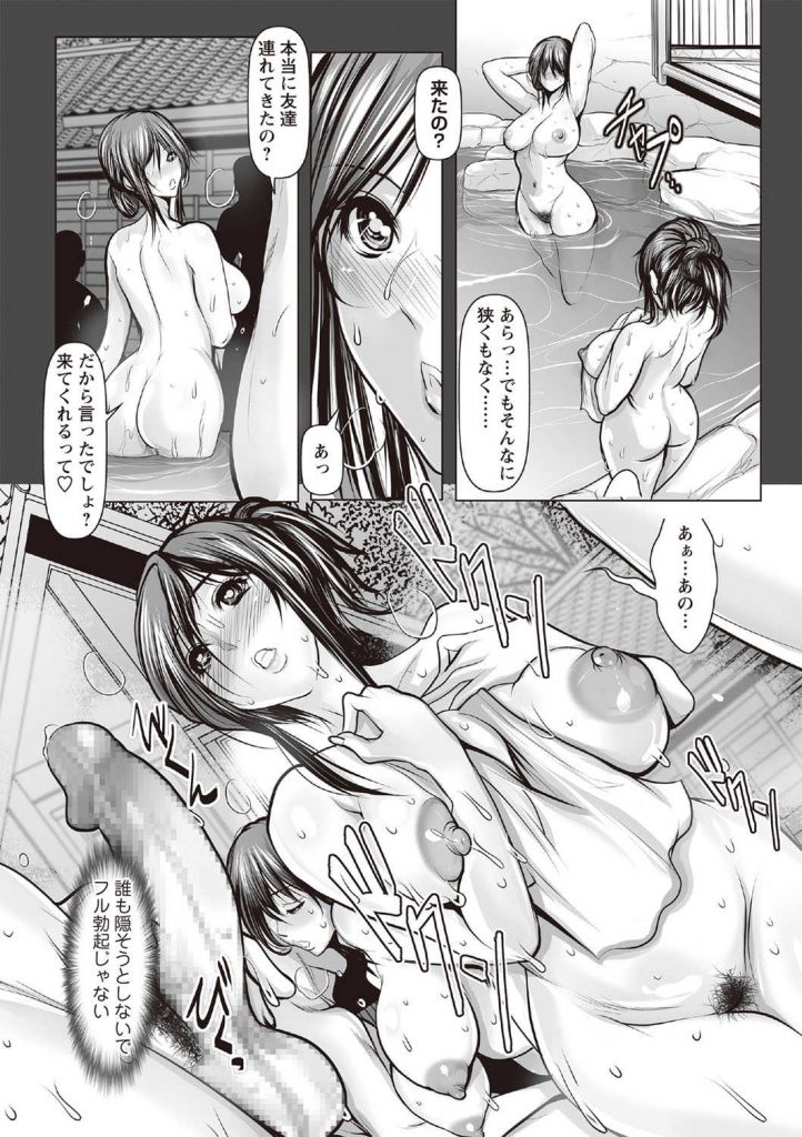 【エロ漫画】混浴温泉で視姦の快感を覚え複数プレイする友達に誘われた爆乳人妻が見ず知らずの男達と輪姦乱交に狂喜する!