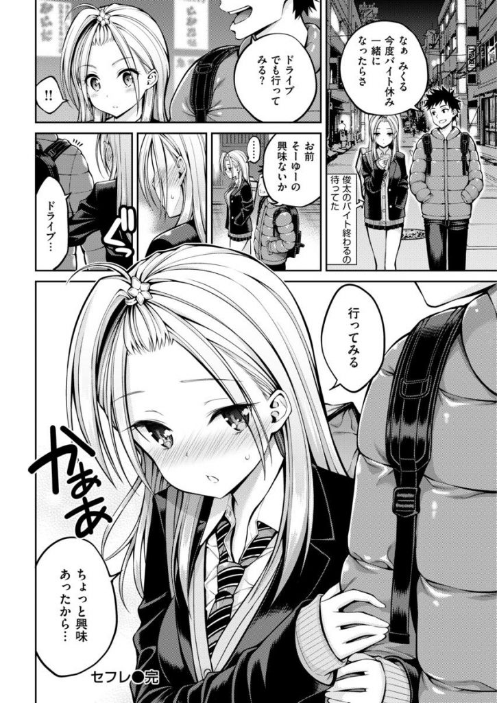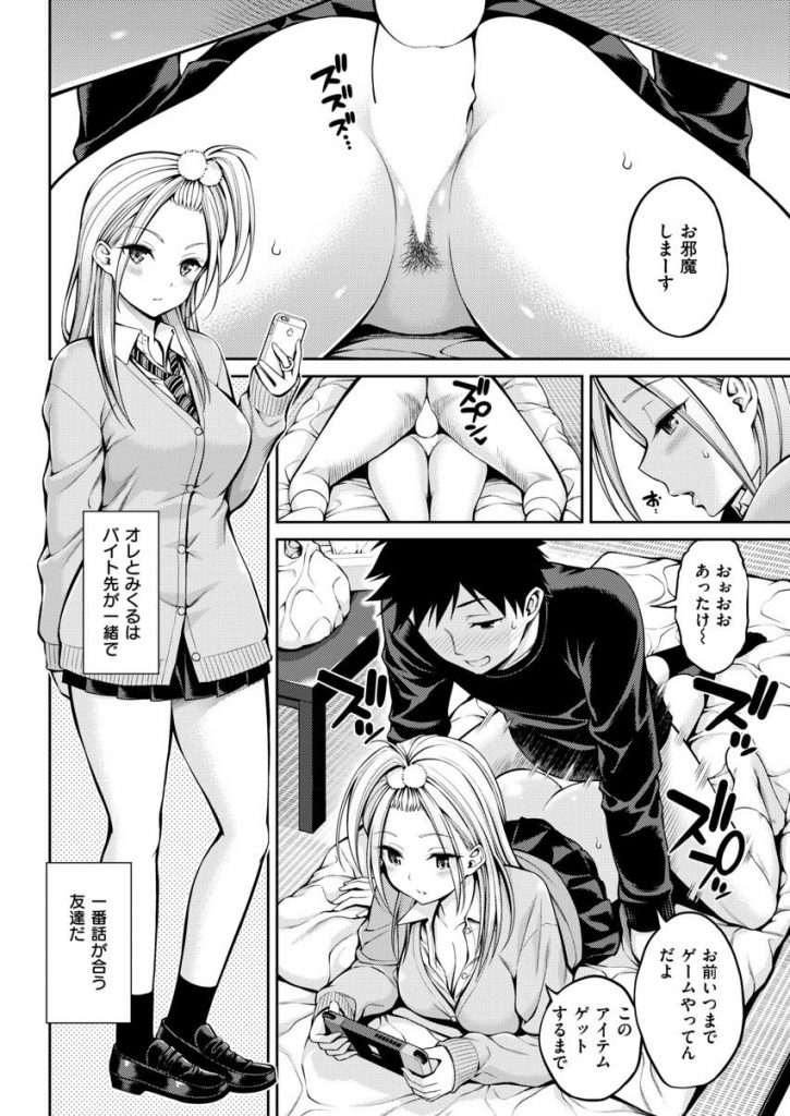 - >【エロ漫画】バイト仲間の処女ギャルJKと初体験してセフレになる大学生が不感症気味の彼女に目隠しプレイで集中させ初イキ!