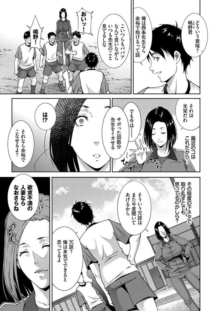 【エロ漫画】胸を強調したピチピチジャージを着て視線を楽しむ人妻教師がヤリチン生徒の挑発に乗りババアの肢体を晒す!