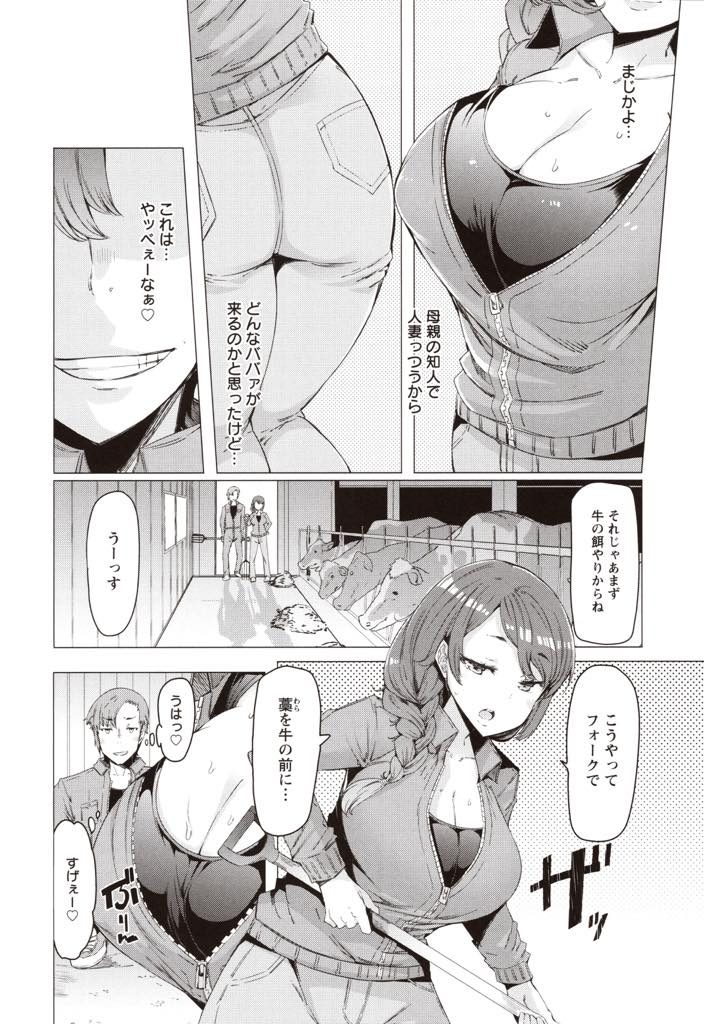 【エロ漫画】畜産業を教わるヤリチンが押しに弱い乳牛並みの爆乳人妻で搾乳練習し乳首イキさせ危険日の孕ませセックス!