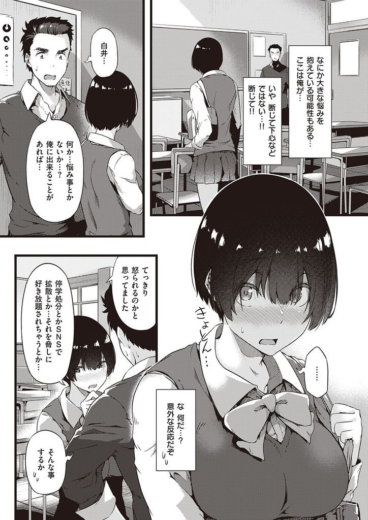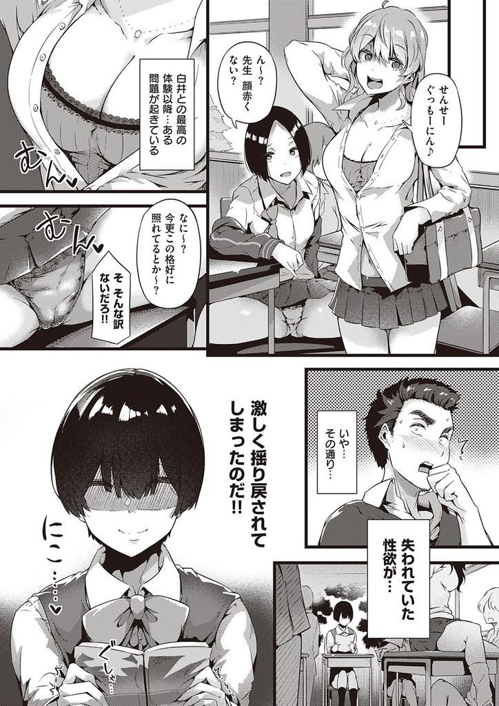 【エロ漫画】野蛮JKが多い女子校で唯一マトモな地味子に心救われる教師が校内自慰現場を目撃しノーパンで迫られ教室淫行!