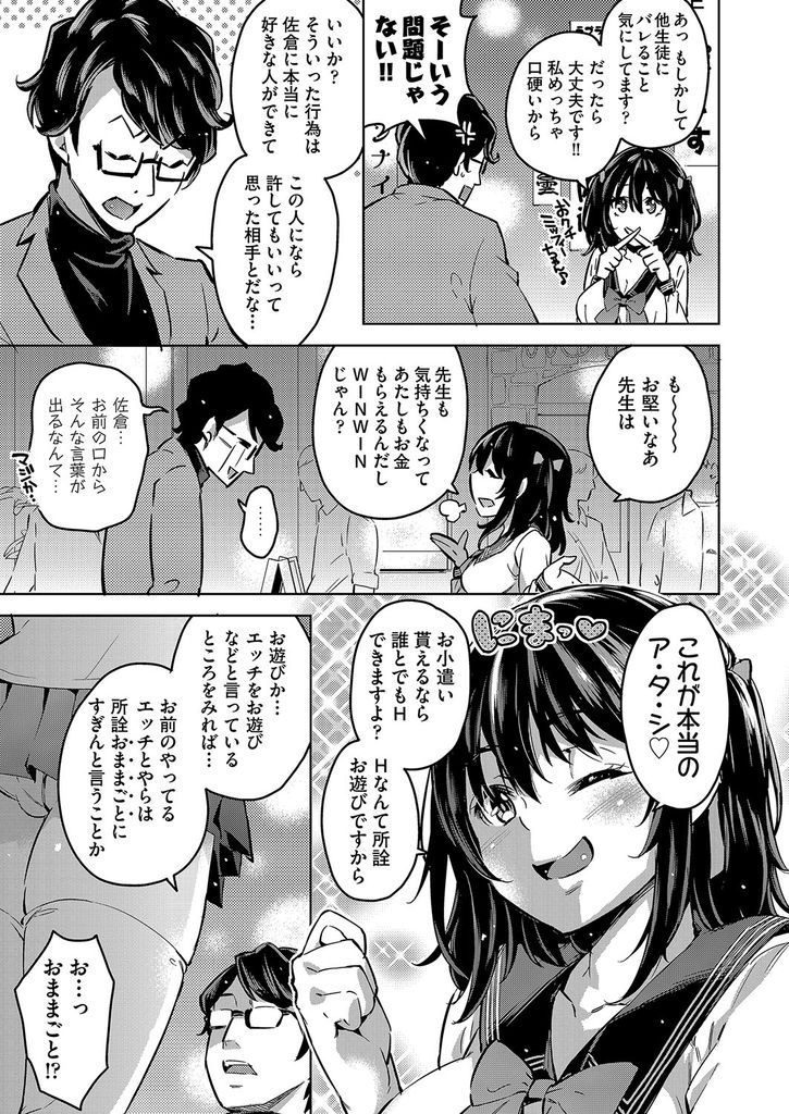 【エロ漫画】歓楽街でパパ活する処女ビッチJKに援交に誘われた担任教師がディルドとは違う本物巨大チンポで大人の性指導!