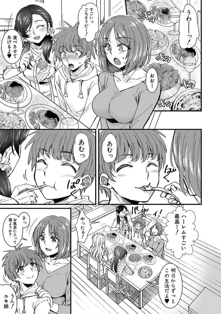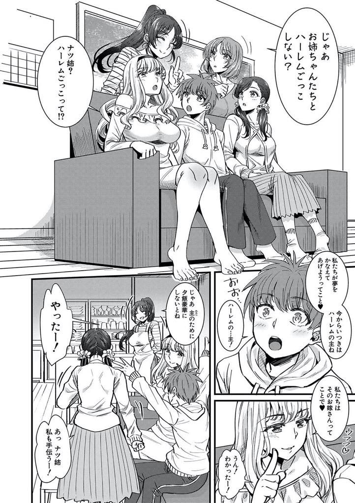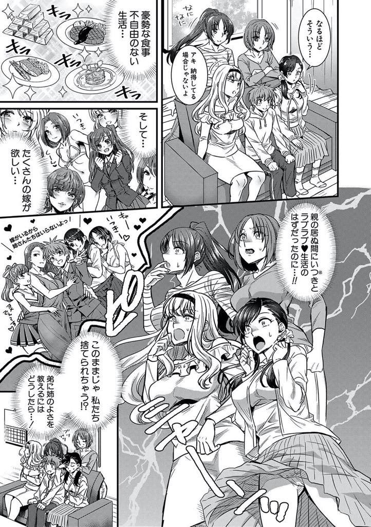【エロ漫画】石油王に憧れる弟にハーレムを提案する美人四姉妹が一夫多妻の生活を満喫させ痴女りまくり酒池肉林の生ハメ!