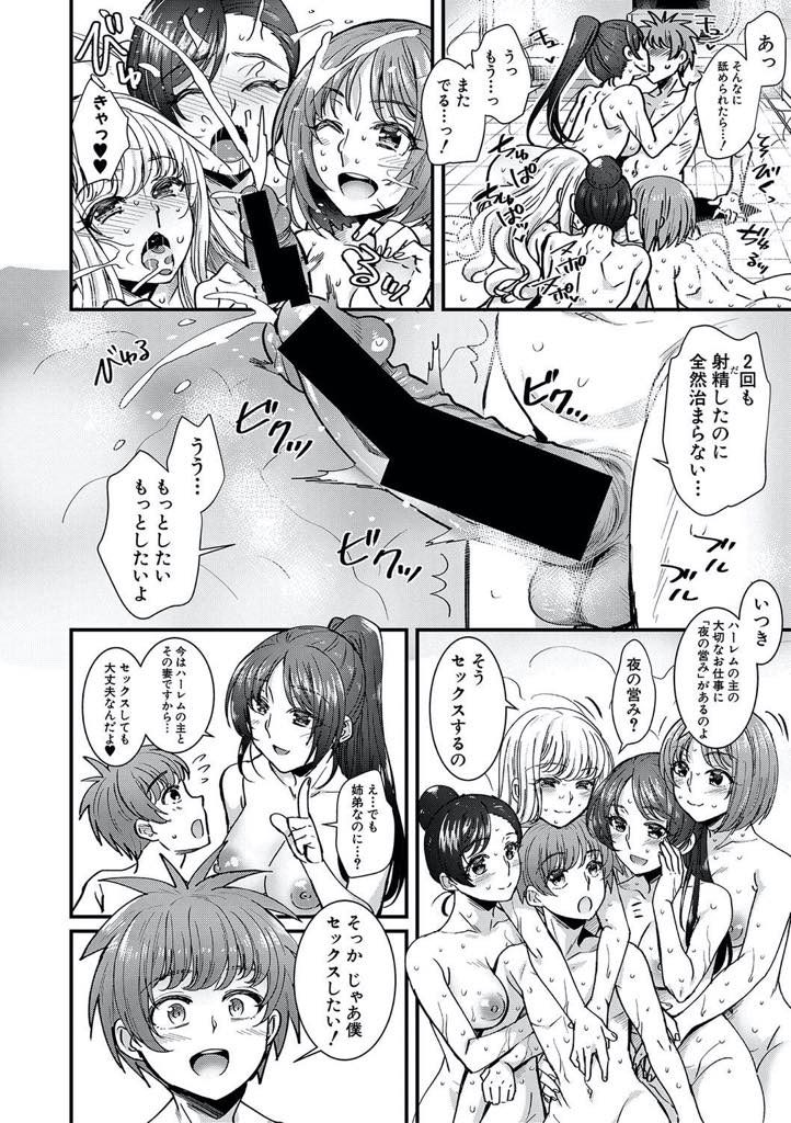 - >【エロ漫画】石油王に憧れる弟にハーレムを提案する美人四姉妹が一夫多妻の生活を満喫させ痴女りまくり酒池肉林の生ハメ!