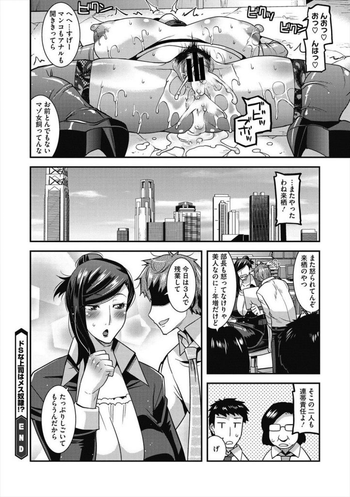 【エロ漫画】会社ではドSの女上司の本性はマンズリしながらフェラ奉仕するちんぽ大好きマド奴隷で野外でアヌスに…