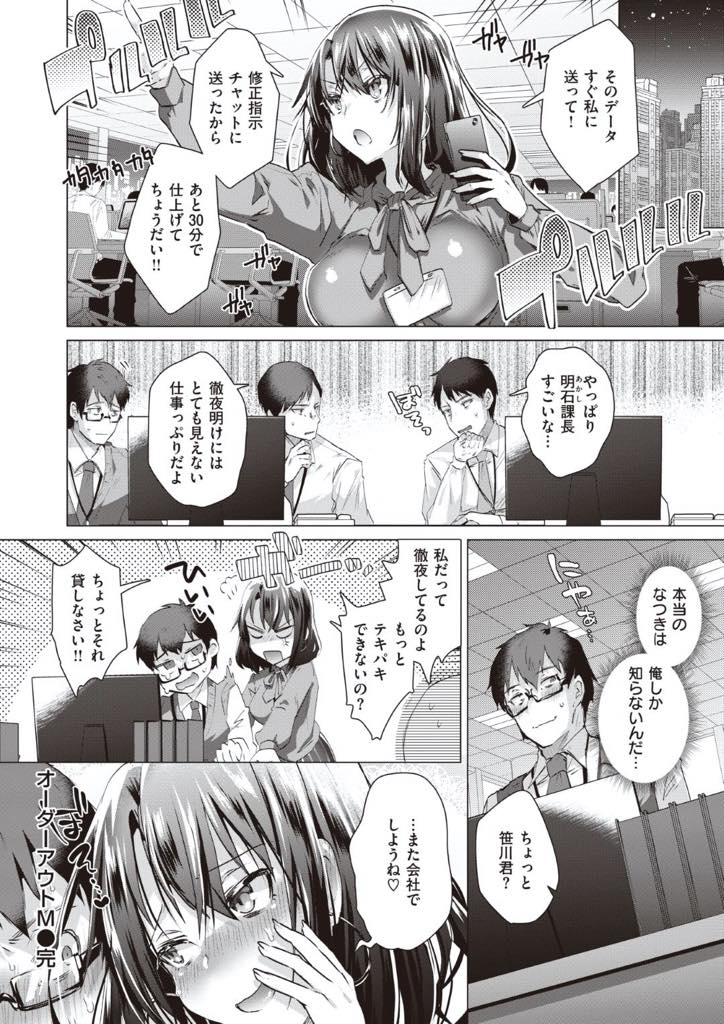 【エロ漫画】会社の先輩OLは仕事が出来る女で後輩くんを叱ってばかりだけど実は二人は恋人同士で甘えたがりので、二人で残業した後もオフィスでタップし中出しセックス!