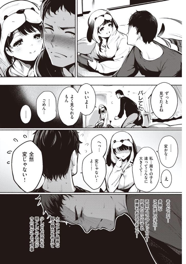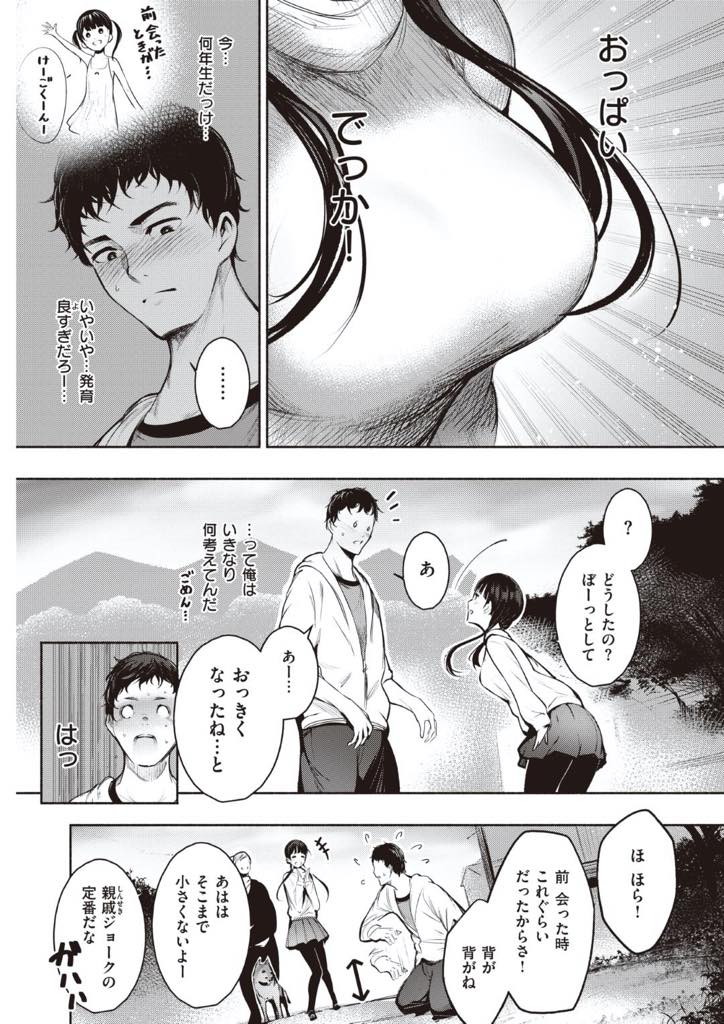 - >【エロ漫画】休みを利用して親戚の叔父さんの家に遊びにきたら、小さかった幼馴染の娘が爆乳で超可愛く成長しててエッチな目でみてしまったけど彼女からもオッパイアピールしてきたので叔父さんにバレないように中出しセックス