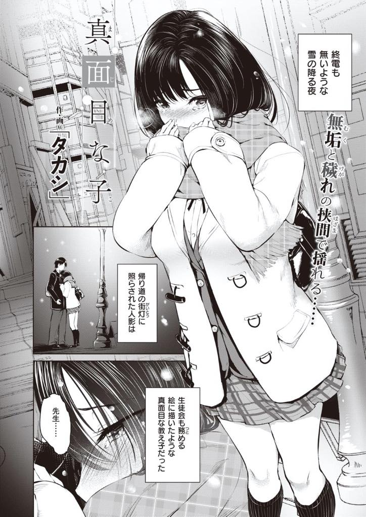 - >【エロ漫画】終電も無いような夜に雪の降る街で泣きながら佇む生徒会も務める真面目な黒髪ボブの美少女JKは真面目に生きてきても良いことが無かったから悪い子にしてくださいと教師に頼み初セックス