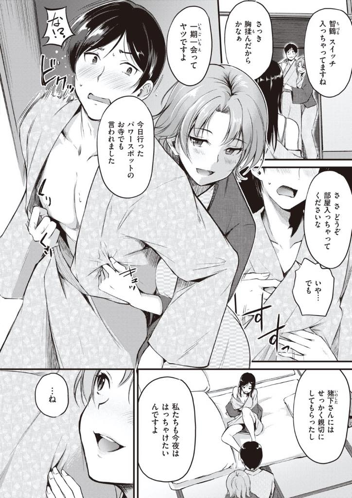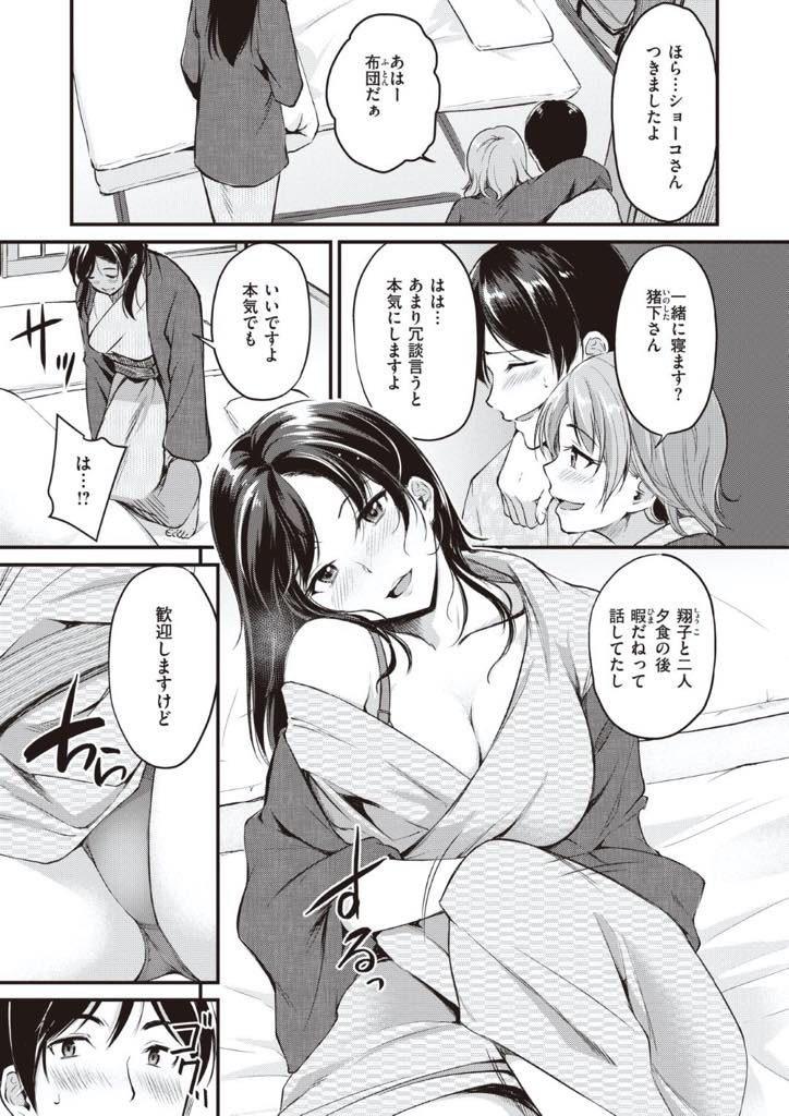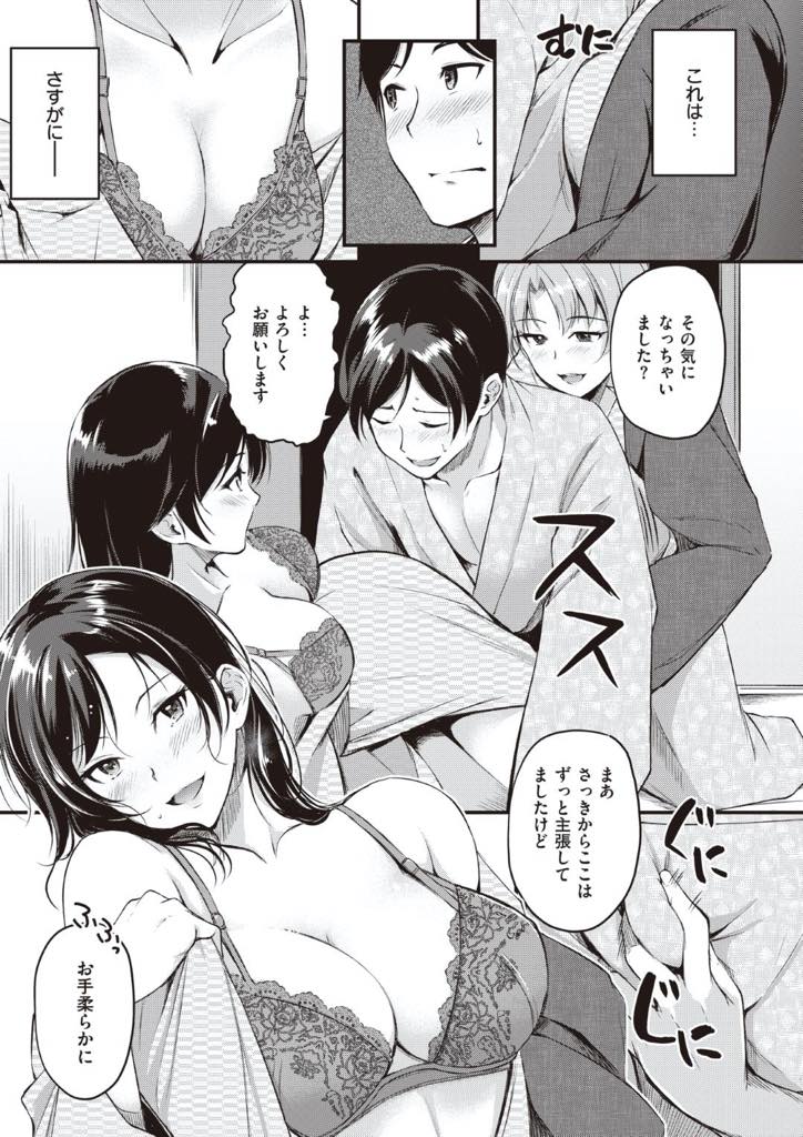 - >【エロ漫画】彼氏と別れたばかり者同士で傷心旅行に来た巨乳お姉さん…旅館で仲良くなった男を部屋に連れ込み二人で責め男に飢えたマンコを慰めてもらい3P中出しセックス