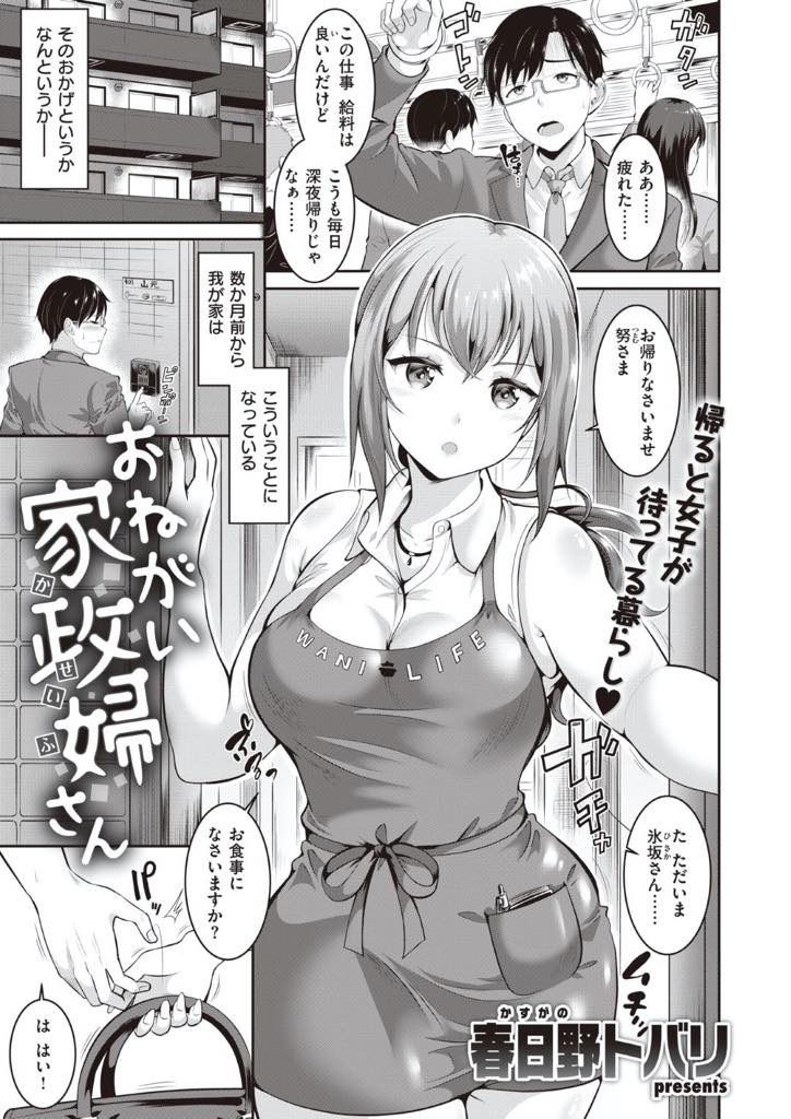 【エロ漫画】素っ気ないけどスキルは一流の巨乳家政婦さんは雇い主の独身サラリーマンに高額な性処理オプションを勧めてバキュームフェラをお見舞いし避妊具なしで危険日マンコに生ハメさせて激エロ騎乗位セックス