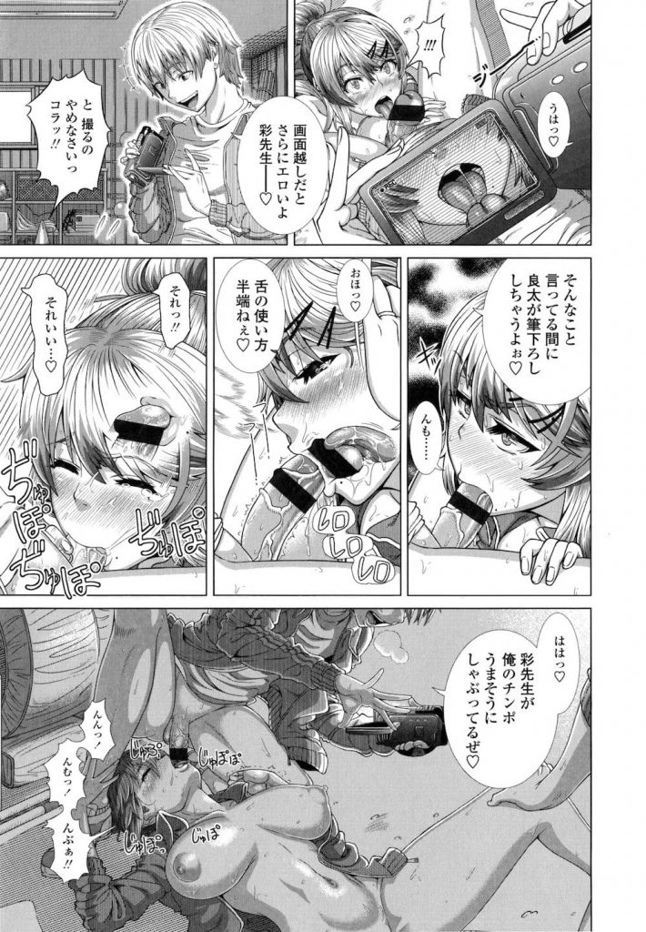 【エロ漫画】テニス部顧問の女先生がエッチなオナ動画で脅迫され垂れ巨乳の体を少年二人に凌辱され孕ませアクメ!