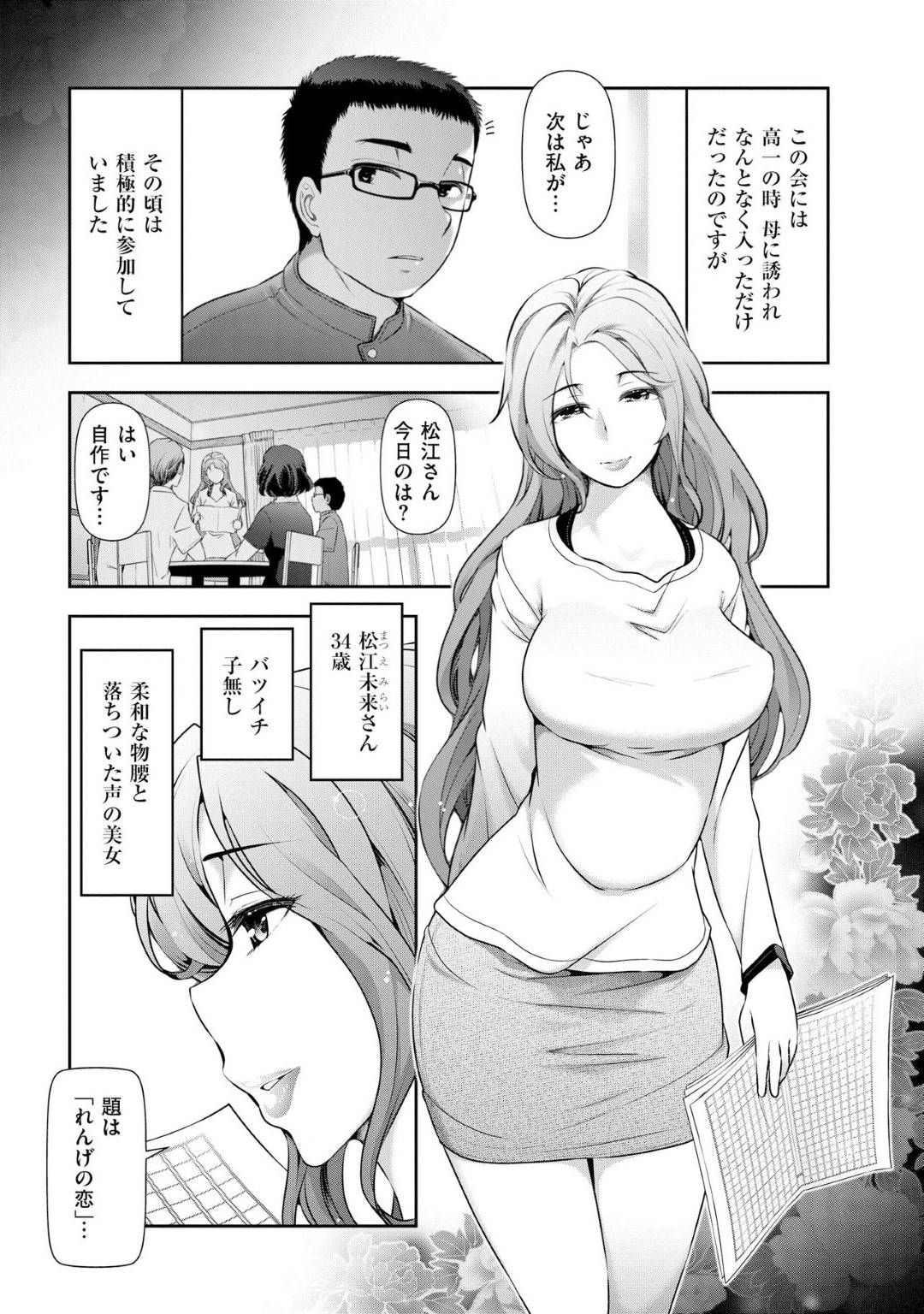 【エロ漫画】地域の朗読会に参加する気弱大学生に官能小説を読み聞かせて誘惑する熟女は、家で2人きりになり逆レイプからの生ハメセックスで童貞を奪う!