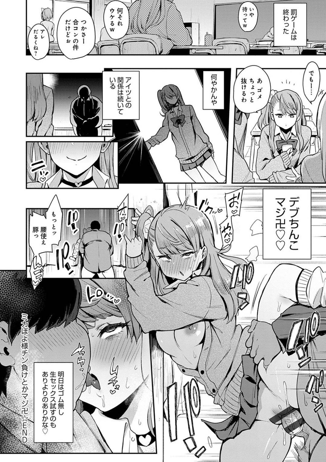 - >【エロ漫画】キモデブ男子を玩具にして遊ぶギャルJKは足コキ調教したあと騎乗位逆レイプで巨根にイカされる