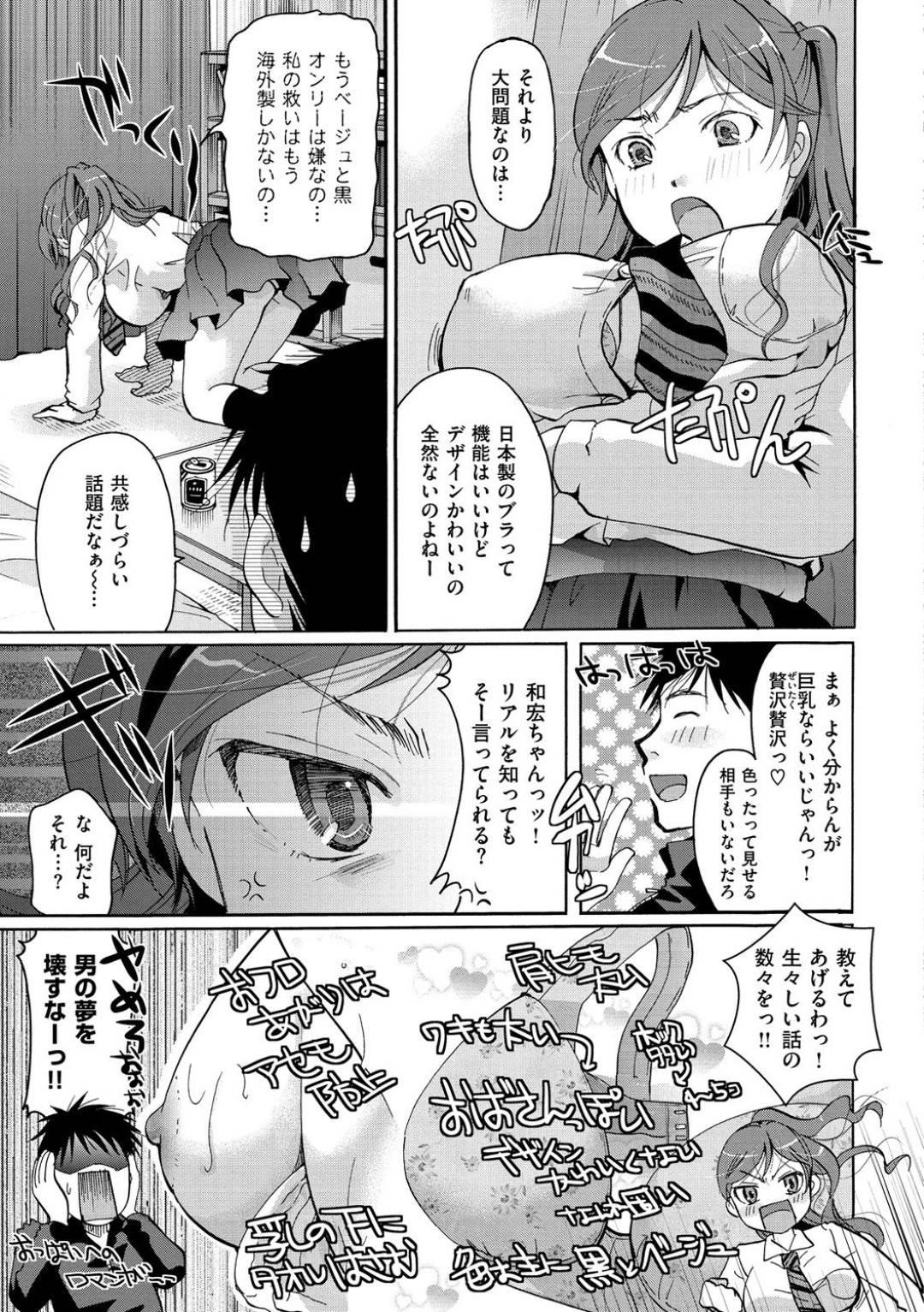 【エロ漫画】幼馴染に下着の事を相談した事がきっかけで彼とエッチな展開になってしまった巨乳幼馴染JK。すっかり勃起した彼のチンポをパイズリしたり、おっぱいを舐めさせたりし、そのまま生挿入セックスへと持ち込む。