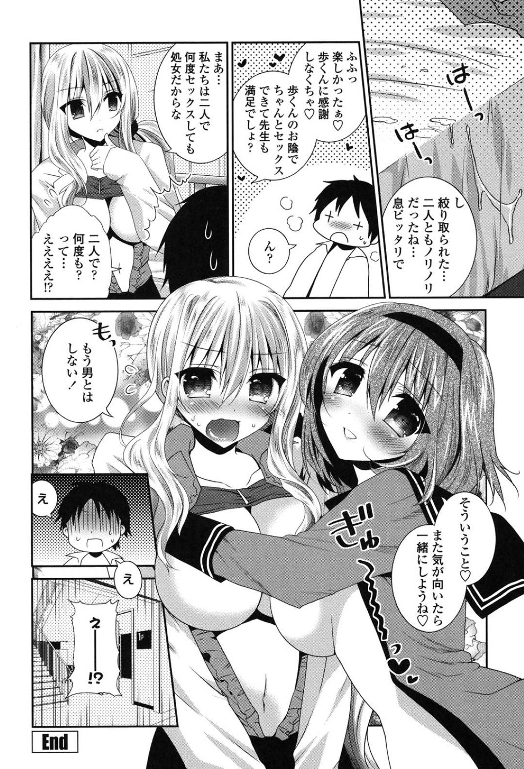 - >【エロ漫画】生徒が保健室でセックスしているのを目撃してしまった処女な巨乳女教師…彼女も混ざる事となってしまい、ダブルフェラした後に、正常位で処女喪失3Pセックス!