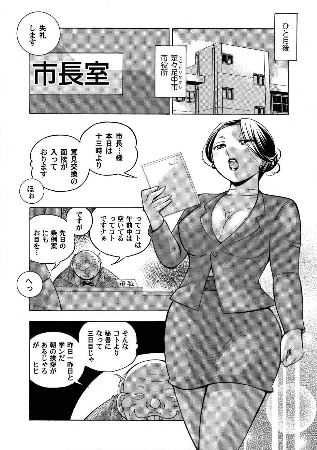市長に勤務中にノーパンで卑猥なポースをさせられたりペニスをおしゃぶりさせられてしまう巨乳秘書!