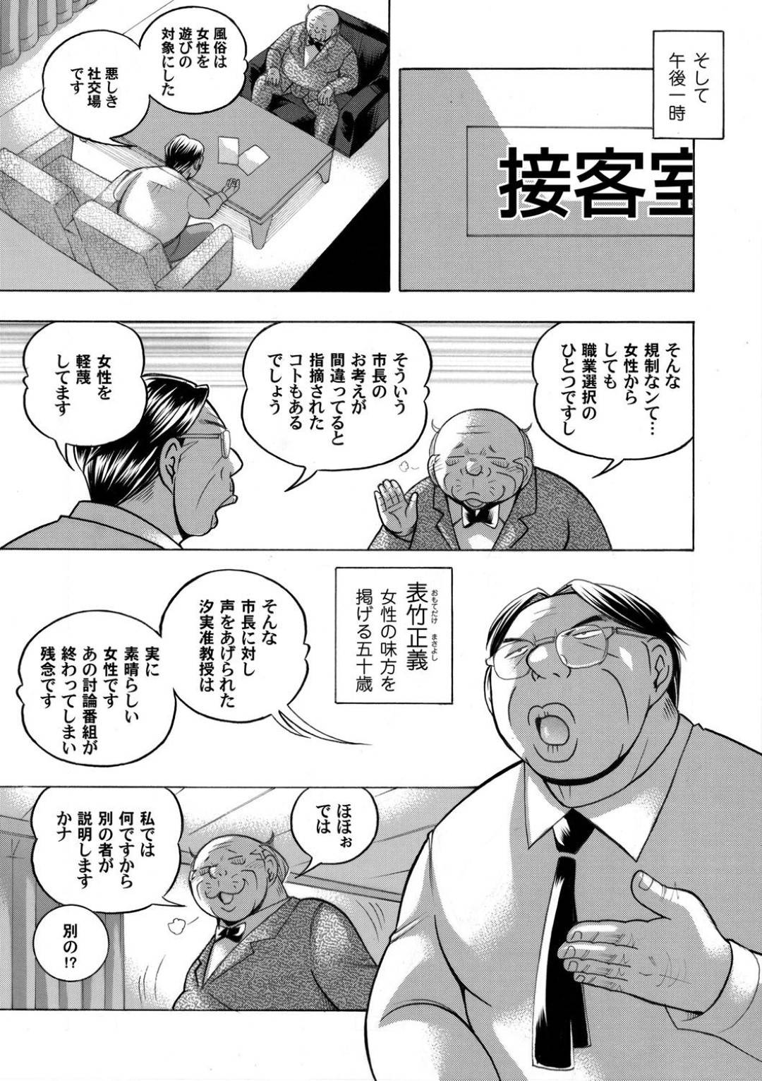 - >【エロ漫画】市長に勤務中にノーパンにパンスト姿を強要される巨乳秘書…卑猥なポースをさせられパンスト越しにクンニされてイク、市議員が市長室に訪れている最中も机の下で市長のペニスをおしゃぶりさせられる!
