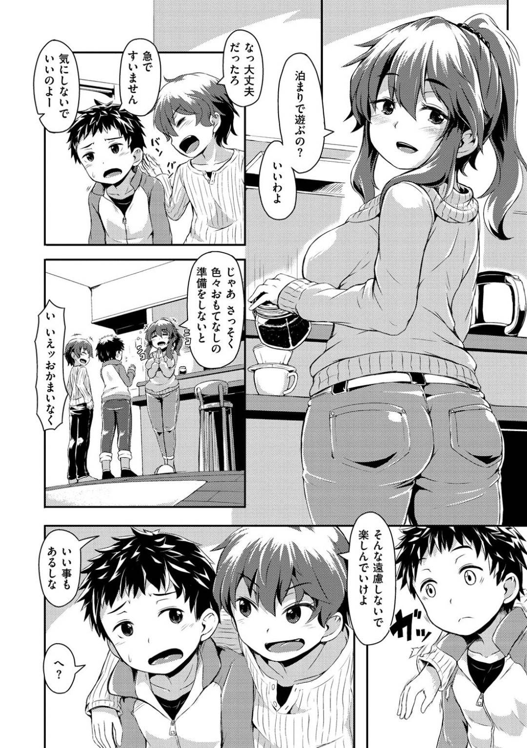 - >【エロ漫画】友達に”いいこと”あるからと誘われてお泊りで遊びに行くことにした少年。迎え入れてくれたママに背中を洗ってもらうと、アソコまで洗ってくれるイチャラブSEX!
