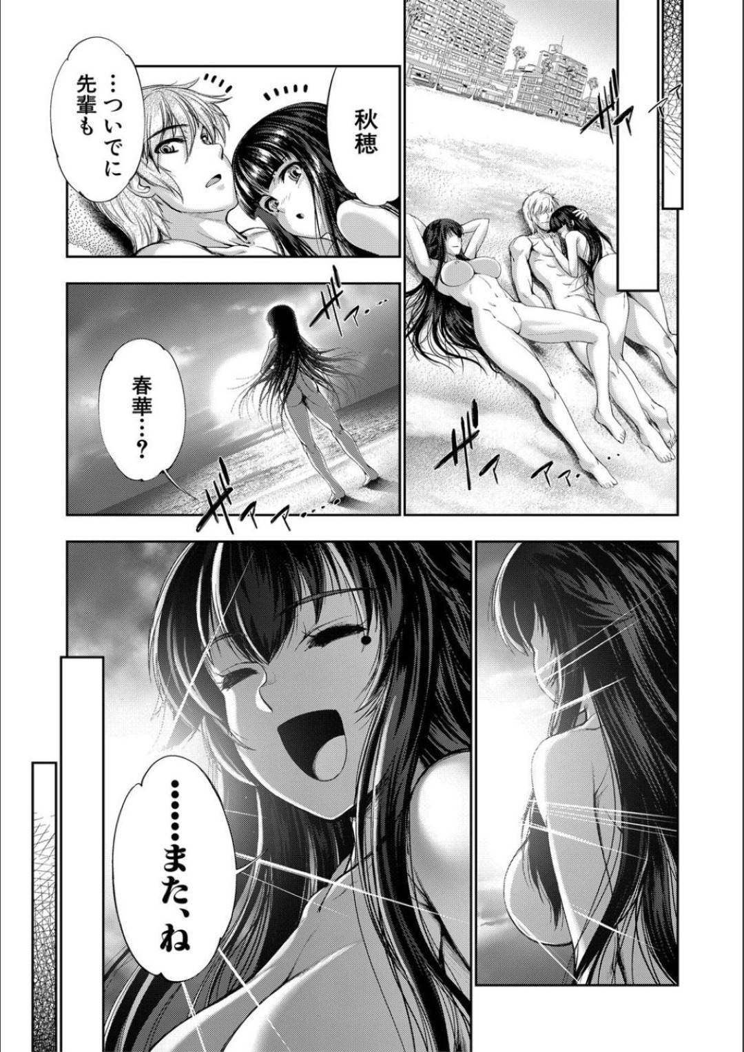 【エロ漫画】ビーチで先輩と3Pセックスする淫乱な巨乳お姉さん…他に人がいないのを良い事に彼女は彼のチンポをしゃぶったり、正常位でチンポを挿入させたりと開放セックスしまくる!
