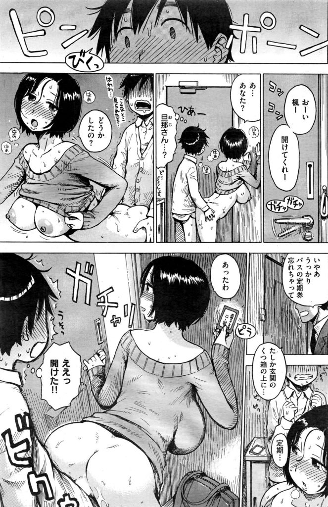 【エロ漫画】お隣の美人妻に玄関先で痴女られ忘れ物で戻った旦那とドア越しチューしてる最中にナカ出しする学生!