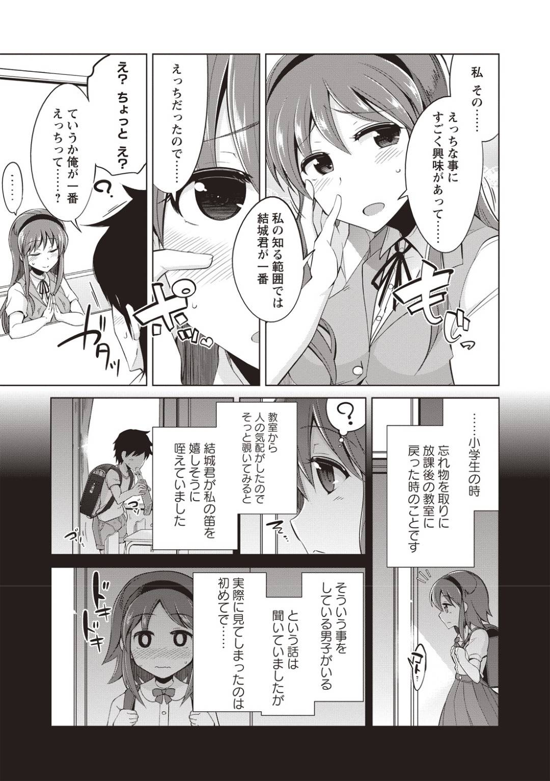 【エロ漫画】清楚系ビッチな同級生に空き教室へと呼び出された主人公。彼が巨根と噂を聞いた彼女は彼のチンポに興味津々のようで、半強引に手コキで射精させた後、騎乗位で童貞を奪う。