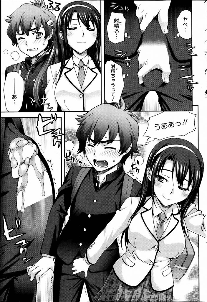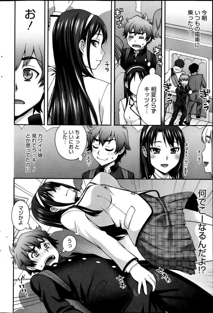 - >【エロ漫画】電車内で痴女行為された男がチンポを出すとスマタで亀頭を擦られ射精すると駅のトイレで逆レイプ!